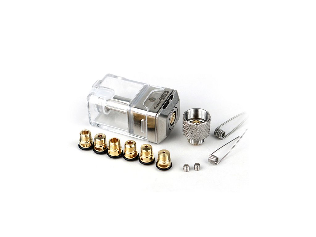 Součástí balení je 7 AFC vložek s průměry od 0,8mm po 3,5mm, které vám umožní nastavit si přísun vzduchu, který pro vás bude ideální. Pin můžete jednoduše odšroubovat a vyměnit za jiný, a to i v případě, že máte tank již osazený. Těšit se můžete na nepřekonatelný MTL projev při použití vložek s menším průměrem i na hutné mraky z volného DL s použitím širších pinů. V prokreslení chuti se DotRBA rovná DotShellu a troufáme si říct, že při správném osazení jeho projev i předčí dokonce za výhodnější cenu. V balení také najdete 510 redukci, kterou našroubujete na spodní část tanku díky čemuž ho můžete umístit na libovolný mod a jednoduše osadit a vyžhavit.