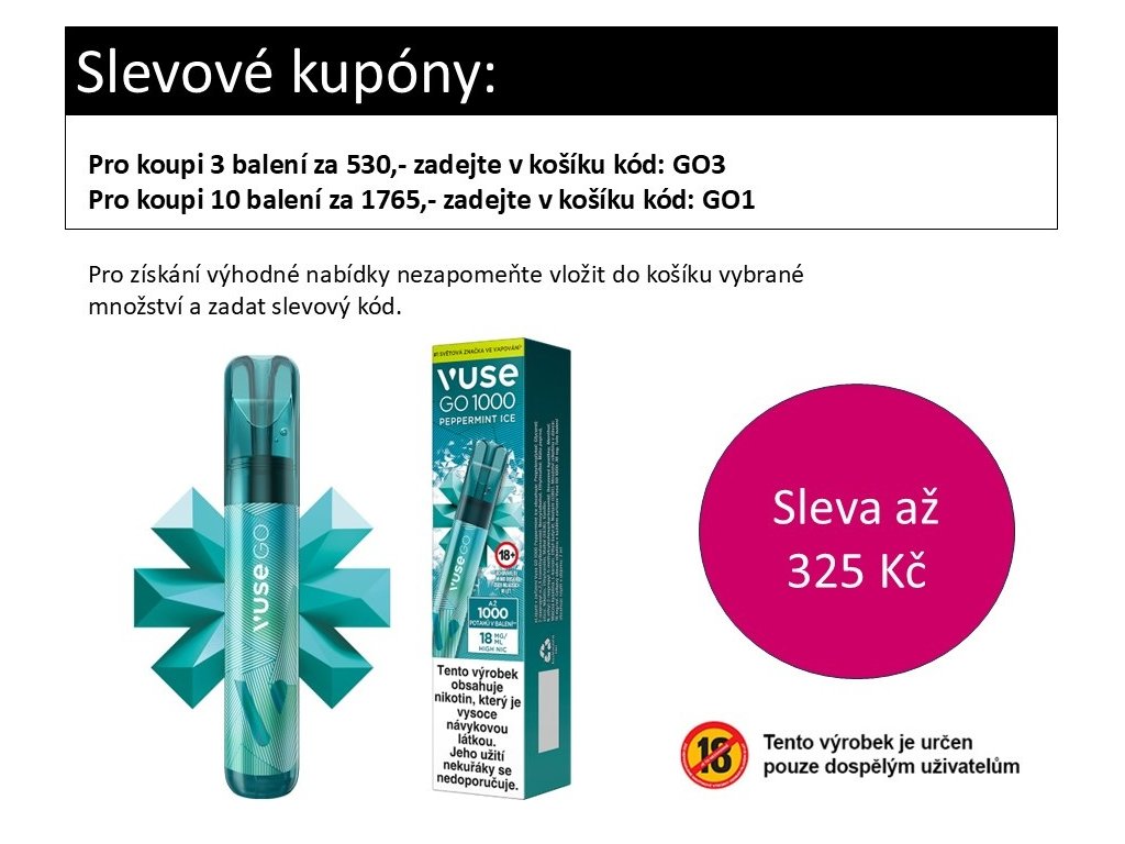 - Vuse GO 1000 je jednorázové zařízení obsahující nevyměnitelnou lithium-iontovou polymerovou baterii.
