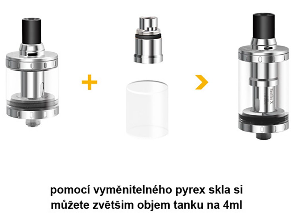 K tanku lze dokupit náhradní 4ml pyrexové sklo pro zvětšení objemu tanku na 4ml.