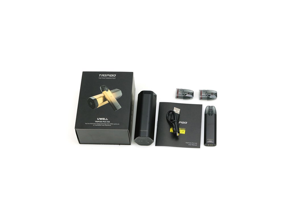 Samotná e-cigareta Uwell Tripod disponuje kapacitou 370mAh a podá maximální výkon 11W. Cigareta funguje na automatickém principu, pro aktivaci tedy není potřeba držet žádné tlačítko. Speciální plnitelné cartridge s technologií Pro-FOCS pojmou solidních 2ml e-liquidu a disponují žhavící hlavou o odporu 1,2ohm. Cartridge byly navrženy tak, aby podávaly maximálně věrnou chuť e-liquidu a můžete je používat jak s klasickými e-liquidy, tak i moderními náplněmi typu NicSalt.
