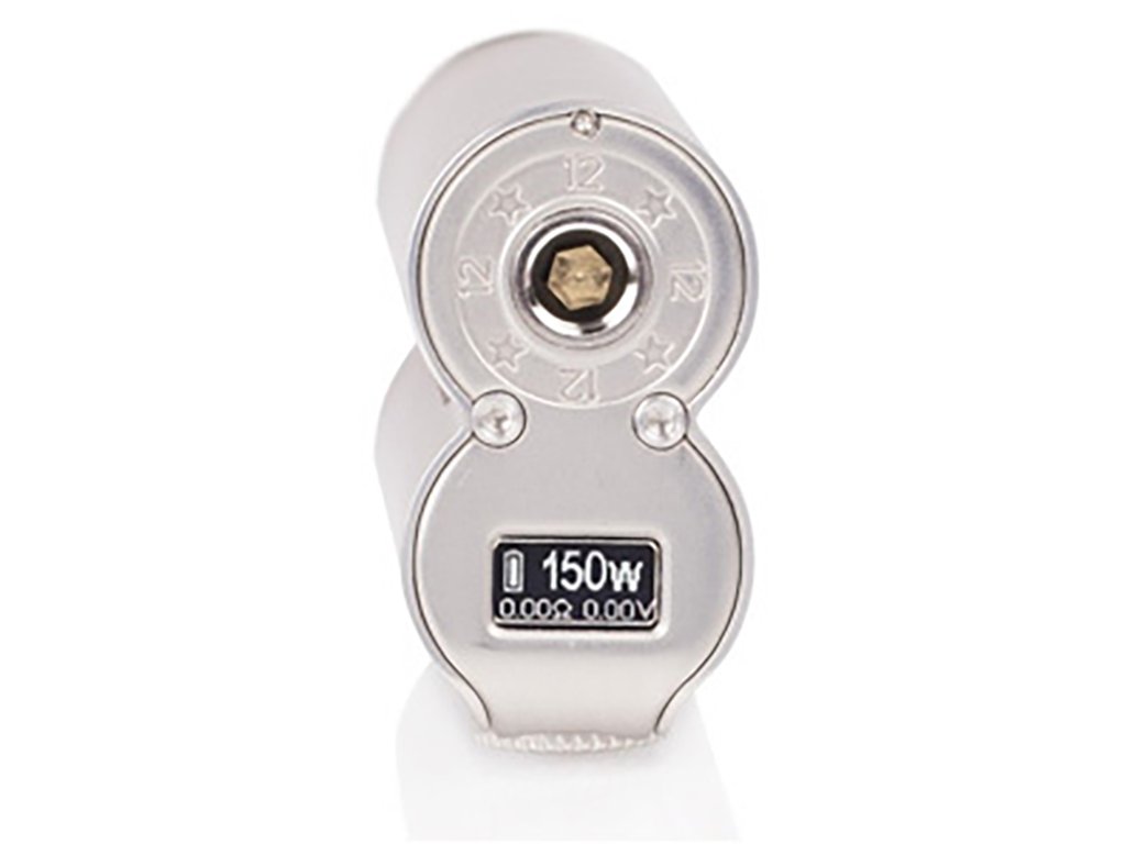 Lze využít i dvě zkratky. Trojklikem se překlopí displej a čtyřklikem uzamknete nastavený výkon tak, aby případným otočením kolečka nemohlo dojít k nechtěné změně výkonu. Na horní straně je umístěn 0,47 palcový OLED displej, který zobrazuje stav baterií, zvolený výkon, odpor atomizéru a napětí, které potřebuje spirálka při žhavení. Závit typu 510 pojme atomizér až do průměru 24mm. Mod potřebuje pro svoji funkci dvojici baterií 18650, které se do něj vkládají spodem.